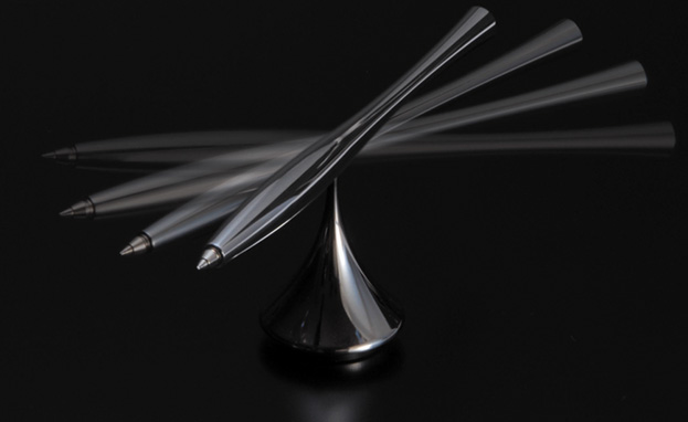 ペンスタンドの軸を中心に、ペンがくるくると優雅にまわります。美しく弧を描いて動く様は、ちょっとした時間の折に、戯れたくなる動きです。